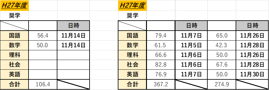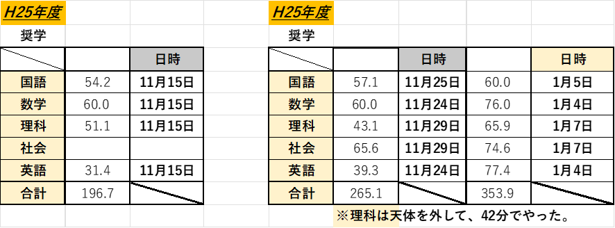 下記の右側の表は昨年の生徒のものです。