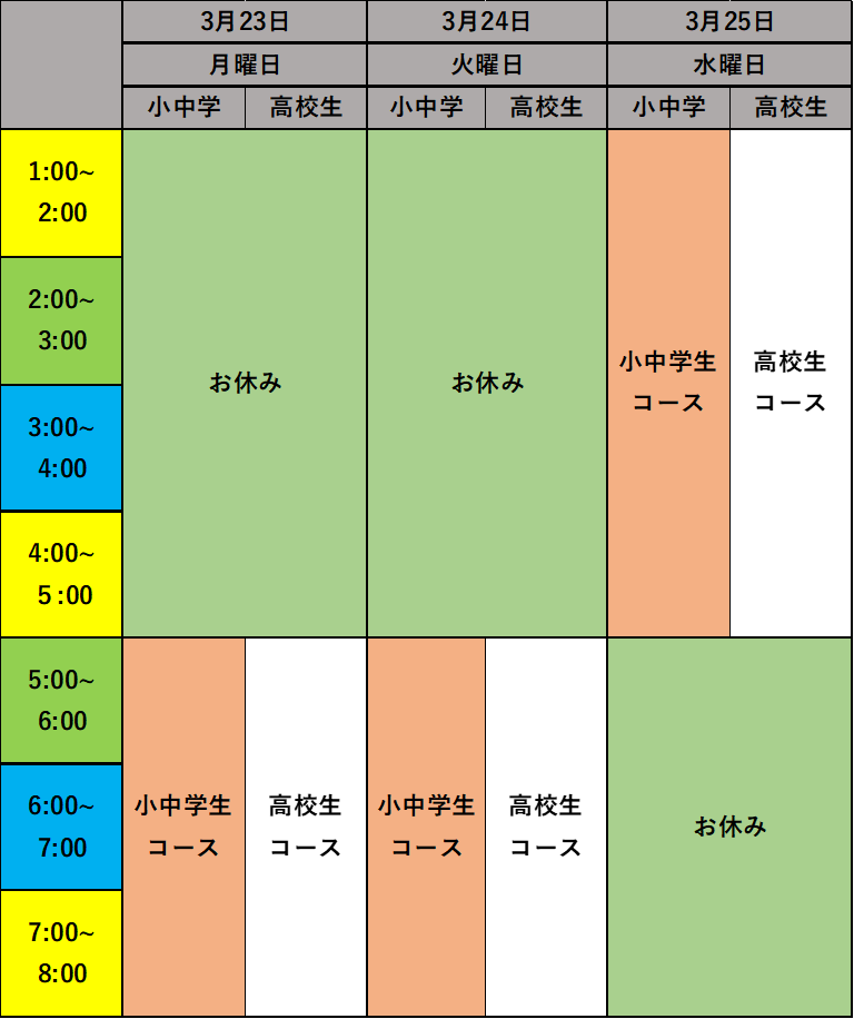 ワカスクは、春期講習会はおこなわず、通常の料金で、1日4時間指導をします。